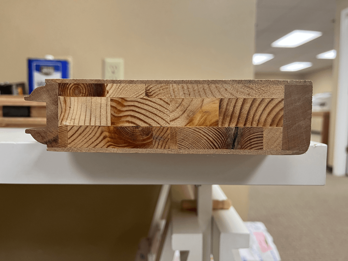 Instead of relying on one large piece of lumber, the core is built from solid hardwood blocks assembled together to form a strong, stable foundation. These blocks are arranged with the grain alternating from piece to piece.
