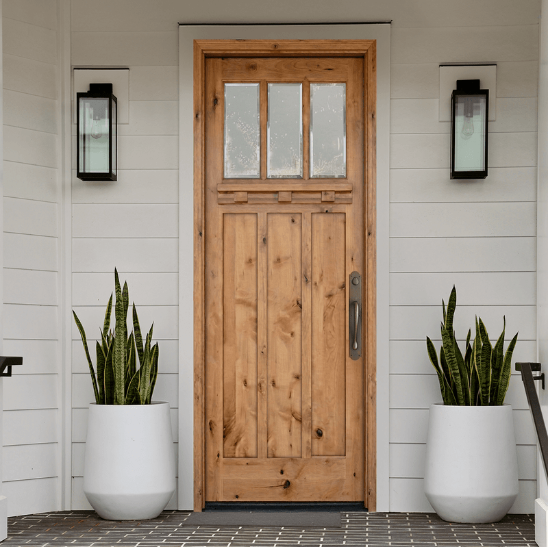 This Knotty Alder 3 Lite Single Front Door delivers a timeless blend of simplicity, warmth, and craftsmanship. Constructed from knotty alder, this door highlights natural knots and grain variation that give each piece a distinctive, handcrafted character. Three clear bevel glass panes across the top invite natural light into the entryway while preserving a clean, classic profile. With its warm wood tones and understated design, this door pairs beautifully with Craftsman, farmhouse, and traditional home styles. Designed for lasting beauty and durability, the knotty alder 3 Lite door adds authentic character and quiet sophistication to your home’s exterior, creating an inviting focal point that endures.