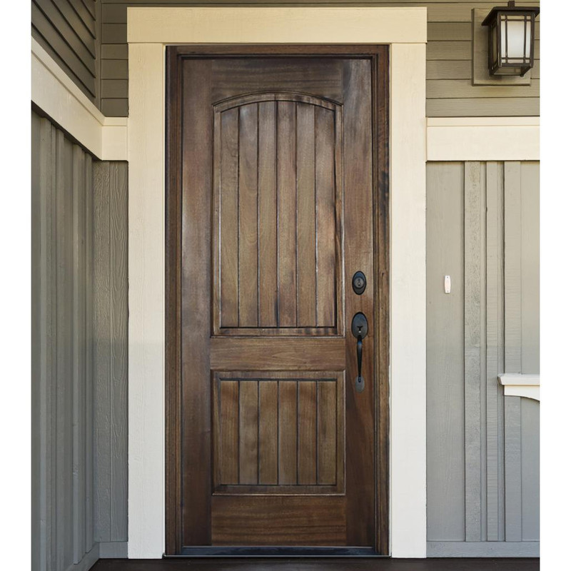 This single African Mahogany entry door features an elegant arched two panel design with a refined vertical V groove panel detail that adds depth, texture, and architectural character. The graceful arch softens the overall profile while the clean vertical lines create a balanced blend of traditional craftsmanship and subtle modern influence. Crafted from premium African Mahogany, the rich natural grain enhances warmth and durability, making this door a striking yet timeless choice for homes seeking a distinctive and welcoming entry.